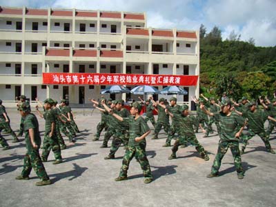 由团市委、市教育局、市直人武部、市少工委、市国防教育训练基地联合举办,市青少年活动中心承办的汕头市第十六届少年军校第二期,经过全体学员、教官、辅导员、工作人员的共同努力,完成各项军训任务,于7月16日上午在国防教育训练基地结业。市直人武部政委、汕头市少年军校名誉政委叶朝南、团市委副书记、第十六届少年军校校长王江锋、团市委学少部部长、第十六届少年军校副校长陈朝华、汕头市教育局体卫艺科科长黄义晟、汕头市青少年活动中心主任、第十六届少年军校副政委林子雄、汕头市第十六届少年军校总教官、汕头警备区教导队队长张军少校、汕头市青少年活动中心副主任李春尔等有关领导出席结业典礼并观看了学员们的汇操表演,同时为学员颁发结业证书和优秀学员,其中林钲欣、黄梓煜、杨婷婷、郑仕扬、高远、王东煜等6名学员被评为学员标兵,市直人武部政委、汕头市少年军校名誉政委叶朝南为其颁奖。
