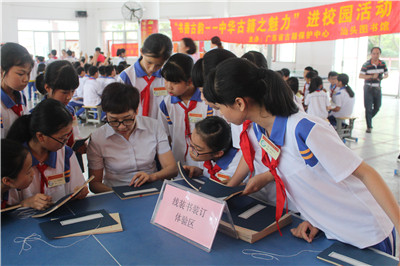 在传统文化进校园活动中,市青少年活动中心携手市图书馆古籍保护宣传志愿队,带领该校近百名学生开启一段别开生面的“古籍保护与文化传承”之旅。在学校大礼堂,志愿者引领到场的同学们首先观看“册府千华——广东省珍贵古籍特展”,聆听古籍工作人员现场讲解。随后,古籍保护知识有奖竞猜活动吸引大批学生踊跃参与,孩子们反应敏捷争先抢答,在热情洋溢的气氛中学习古籍历史文化知识。同样被层层包围还有古籍修复演示区,同学们目不转睛地盯着古籍修复师现场演示,有兴趣的同学还亲自动手体验,当了一回“小小修复师”。最后,同学们围坐在桌子旁边,孩子们手握仿古线装书,在志愿者的指导下体验古籍装订乐趣。短短半天的时间,同学们玩转古籍知识,陶醉其中,仿佛“穿越”到了古代书房,在学习思索、动手体验中感受古籍书香和传统文化。