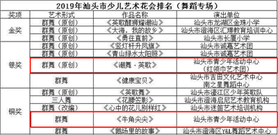 2019年5月26日,由汕头市文化广电旅游体育局主办、汕头市文化馆承办的2019年汕头市少儿艺术花会在汕头文化艺术学校成功举行。共有35个表演节目亮相舞台,其中舞蹈类12个、戏剧曲艺类8个、音乐类15个,节目形式丰富多样、热情动感、寓意深远。本次比赛决出舞蹈类金奖3个、银奖4个、铜奖5个;戏剧曲艺类金奖2个、银奖3个、铜奖3个;音乐类金奖4个、银奖5个、铜奖6个;优秀组织奖2个、优秀园丁奖若干。其中,我中心红领巾艺术团舞蹈队参与的舞蹈专场群舞(原创)节目《潮舞·英歌》荣获舞蹈类银奖,器乐表演部的少儿舞蹈培训学员参与的群舞(原创)节目《牛角尖尖》荣获舞蹈类铜奖。