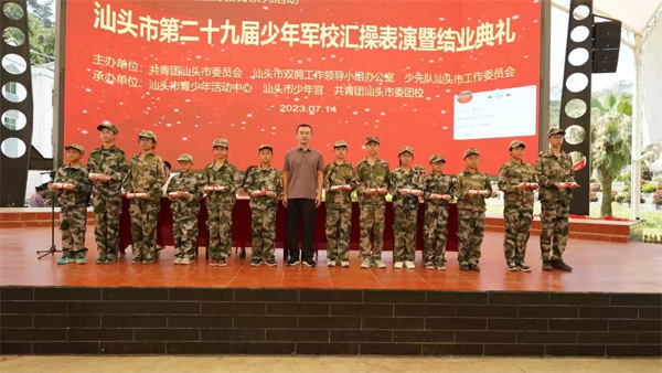 汕头市少先队总辅导员汤华杰同志代表主办单位对本期军校活动进行总结,他指出五天来的军校生活,同学们战胜了时间紧、内容多、标准高、训练难度大等诸多困难,圆满完成了各项军训任务,对同学们在军训中取得的成绩表示热烈的祝贺!军营生活使同学们接受了锻炼,经历了考验。学到了基本的军事知识和军事技能,同时磨炼了意志,提升了综合素质。希望同学们把这次军训成果尽快转化为努力学习、刻苦钻研的强大精神动力,进一步提升思想素质,砥砺品格,强健体魄,增长本领,努力成长为有理想、有血性,能够堪当民族伟大复兴重任的时代新人。市青少年活动中心副主任林纯玲同志向学员代表颁发结业证书。