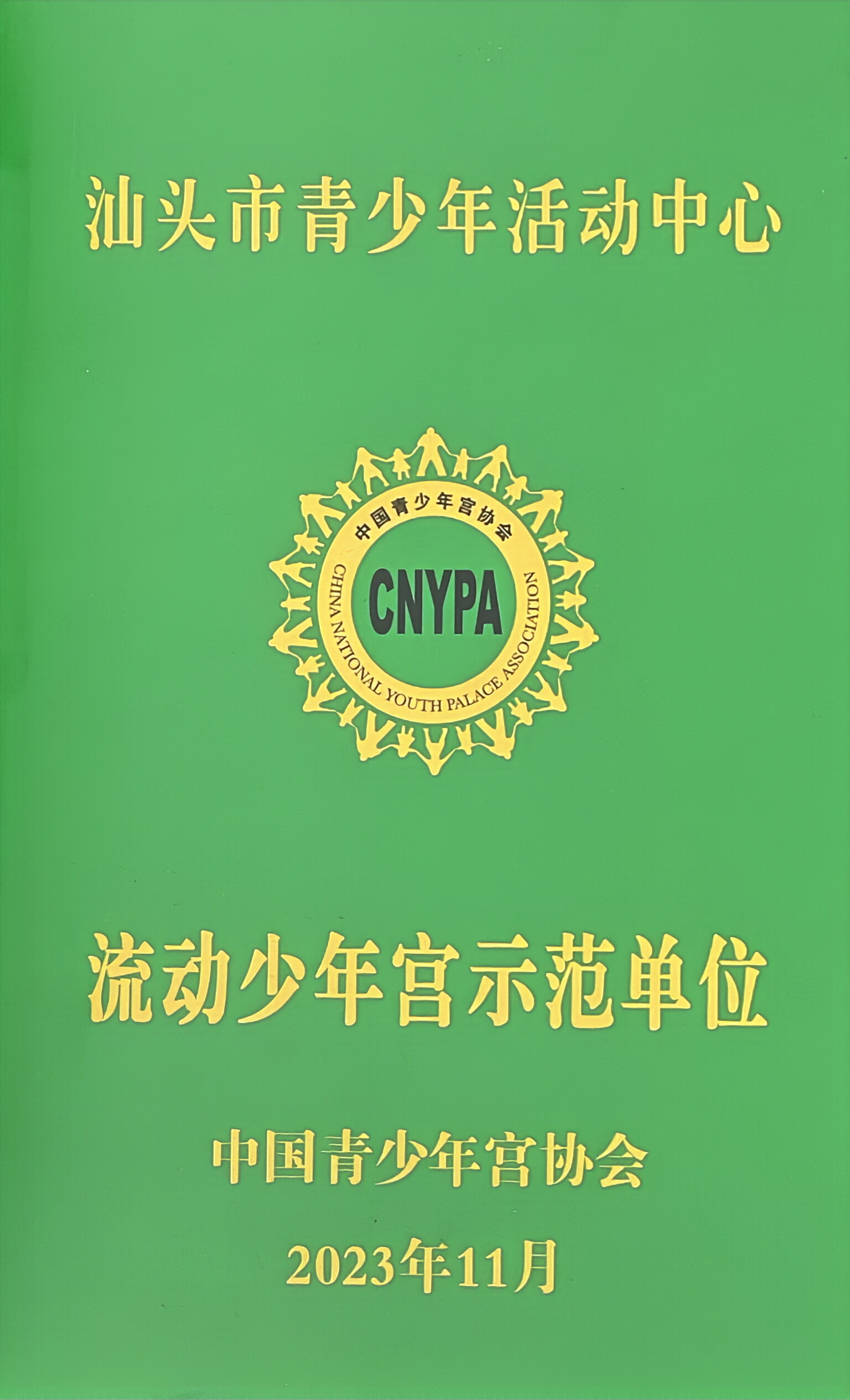 2023年11月,汕头市青少年活动中心被中国青少年宫协会评为2023年度“流动少年宫示范单位”,中心朱韶春同志获评“流动少年宫优秀辅导员”,张健亭同志获评“流动少年宫最美志愿者”