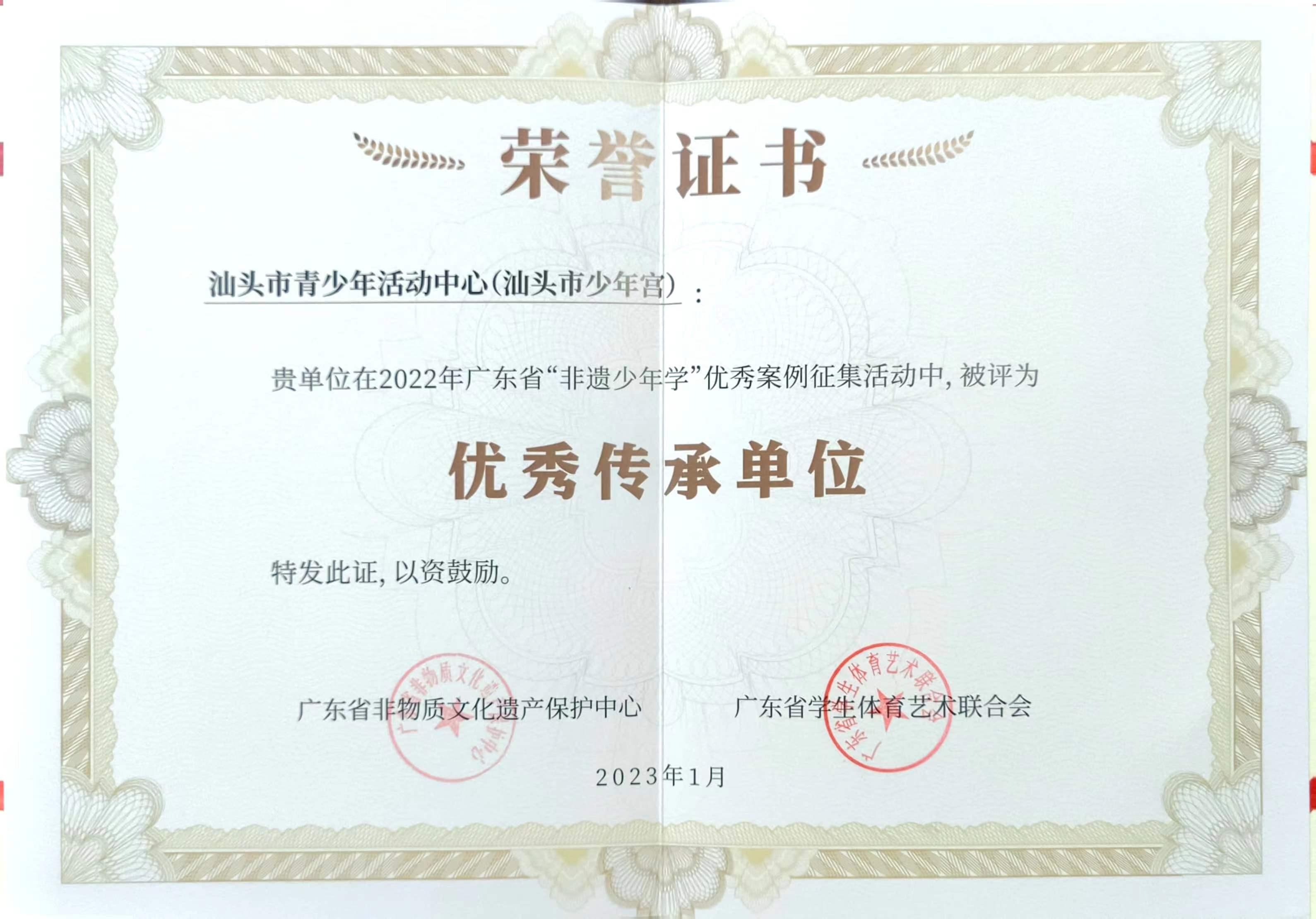 2023年1月,由广东省文化和旅游厅、广东省教育厅、共青团广东省委员会、少先队广东省工作委员会、南方报业传媒集团指导,广东省非物质文化遗产保护中心、广东省学生体育艺术联合会主办的2022年广东省“非遗少年学”优秀案例征集活动获奖名单揭晓,汕头市青少年活动中心(汕头市少年宫)以案例“篆刻艺术公益课堂进校园“”获评“优秀传承单位”