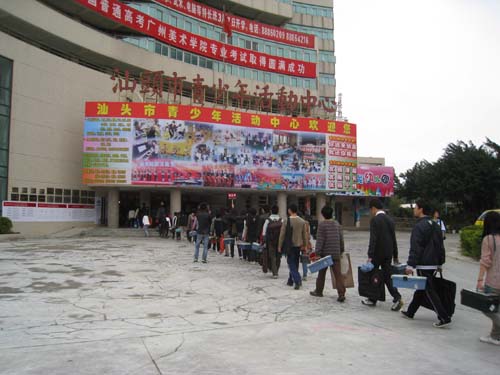 2月28日,广州美术学院2009级普通高考术科考试在粤东唯一定点考场——汕头市青少年活动中心开考,共有来自汕头、潮州、揭阳、汕尾、梅州粤东五市的近1594名考生应考。此次考试内容涉及色彩、素描、写生三个方面内容,全面客观地考核学生的美术功底。为确保此次美术专业高考的顺利完成,市考试中心领导专程巡视了考场,市公安局、市环保局、市供电局等单位也给予了大力支持,让考生们在安全、安静、舒适的考试环境中完成作品。