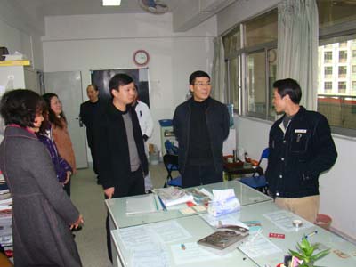王书记(左二)一行在中心林子雄主任(右二)陪同下到中心各部室看望教职员工场面