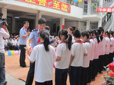 龙湖区希望学校是我市农民工子女就读较集中的一个学校, 就读学生有1200多名。当天上午,在学校隆重举行庆祝“六一”儿童节文艺联欢会之际,市公安局团委洪映文书记带领刘洪川、詹嘉莉、黄毅炯等团干和团员青年民警,代表全局团员青年民警,为农民工在读子女送上了节日的祝福,并为30名特困农民工在读子女送上了书包文具等慰问品。同时,组织交警支队团员青年民警在联欢会上,举办交通安全知识宣传活动暨快乐交通安全知识抢答节目,全场学生踊跃参加,整个现场呈现开心快乐的气氛。