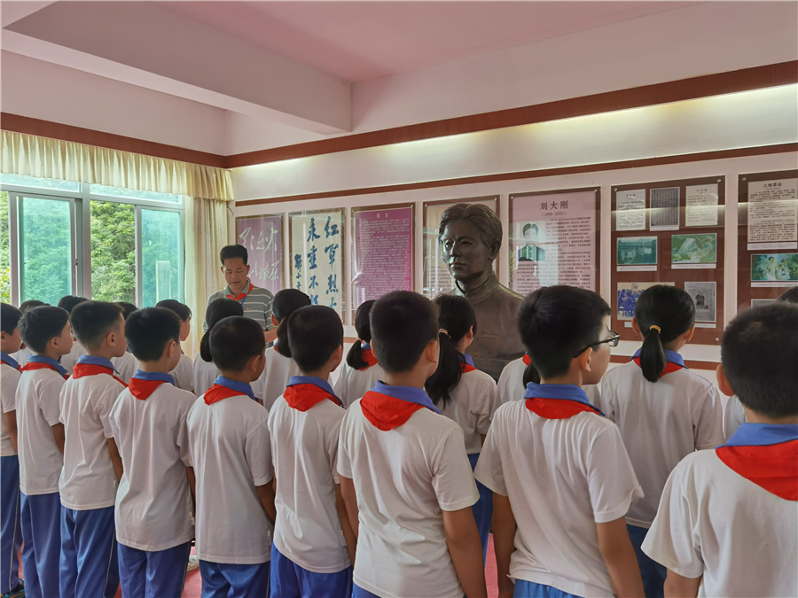 在革命纪念碑旁,是七位革命烈士的雕塑,炯炯有神的目光坚定地望着前方,雕塑下镌刻着烈士们的英雄事迹。深溪小学总辅导员刘镇荣老师向大家详细介绍了土地革命战争时期英勇牺牲的潮普惠苏维埃政府副主席刘大刚,以及潮阳县赤卫队队长刘明合等七位革命烈士的英雄事迹,带大家重温革命烈士为民族的幸福抛头颅、洒热血的场景。