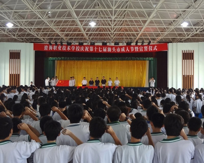 在学校举行的成人宣誓仪式上,我校德育线的有关领导出席了本次活动;900名18岁青年学生面对国旗,向祖国和人民许下铿锵誓言,并合唱汕头市成人节节歌,开始了人生新的旅程。学校德育处黄燕朓主任在宣誓仪式上做了讲话,他对本次成人宣誓活动给予了肯定,对参加仪式的青年学生给予了鼓励,也提出了希望和要求,勉励与会学生要增强爱国主义情感和公民意识,树立信心,发奋成才,以高度的责任感,为祖国的发展和家乡的建设作出应有的贡献;学生成人代表也在仪式上发言,勉励同学们要发奋学习,德技兼备,掌握好专业技能,认真践行科学发展观,争当“四有新人”,以赤诚之心去担负起建设祖国、创造未来的重任。宣誓仪式在全体青年学生合唱汕头市成人节节歌的歌声中降下帷幕。