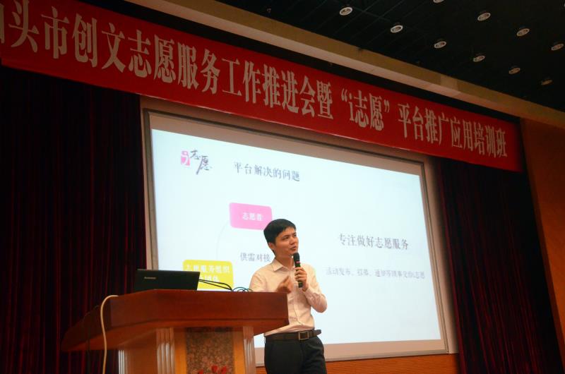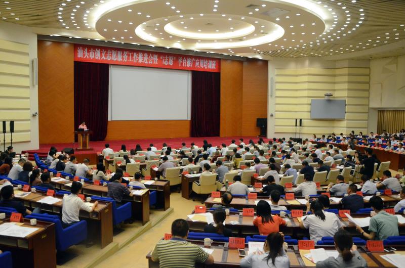 2017年5月12日上午,在市创文工作一周年之际,为更好地发挥志愿服务工作在创文工作中的重要作用,动员组织更多单位加入文明创建行动中来,根据市政府创文工作部署,市创文办、团市委联合在市委会议中心大会堂召开汕头市创文志愿服务工作推进会暨“i志愿”平台推广应用培训班, 广东省青少年事业促进中心主任、青少年大数据及新媒体中心负责人龚庆同志,团市委书记陈玩雪,市创文办副主任杨丹阳,市民政局副调研员袁树刚、团市委副书记王江锋,团省委“i志愿”系统及注册志愿者证工作负责人朱吉鹏同志出席了活动,以及来自市直各单位志愿服务工作分管领导、全市各区(县)创文办负责人、团委书记、各镇(街道)创文工作负责人,各志愿者组织代表约300人参加了培训班。